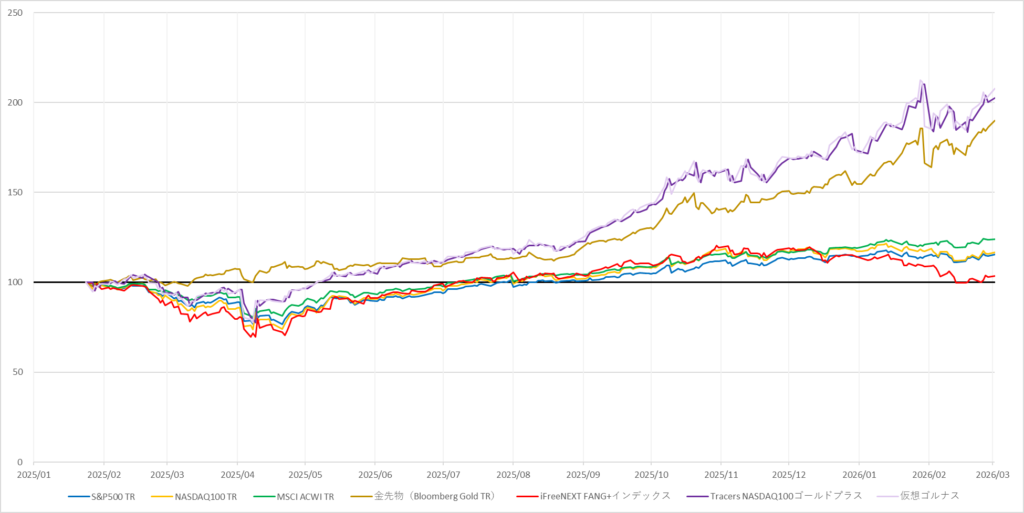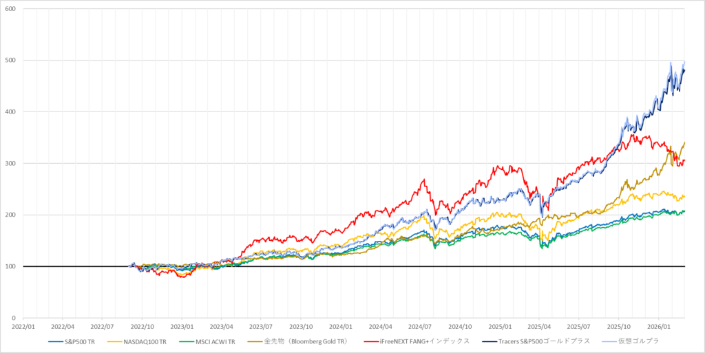 | S&P500 TR | NASDAQ100 TR | MSCI ACWI TR | 金先物(Bloomberg Gold TR) | iFreeNEXT FANG+インデックス | Tracers S&P500ゴールドプラス | 仮想ゴルプラ |