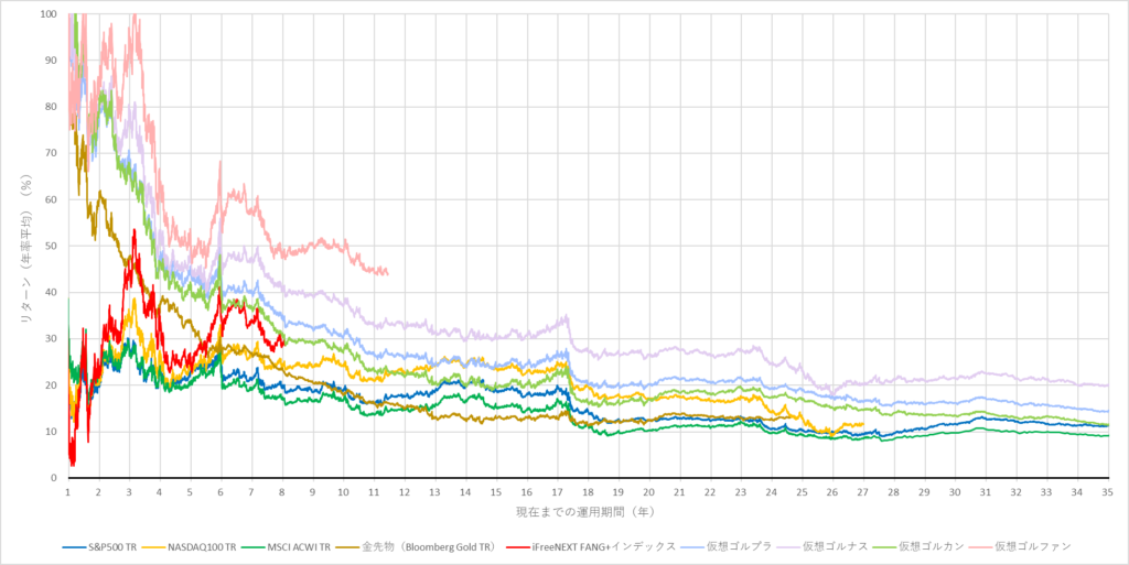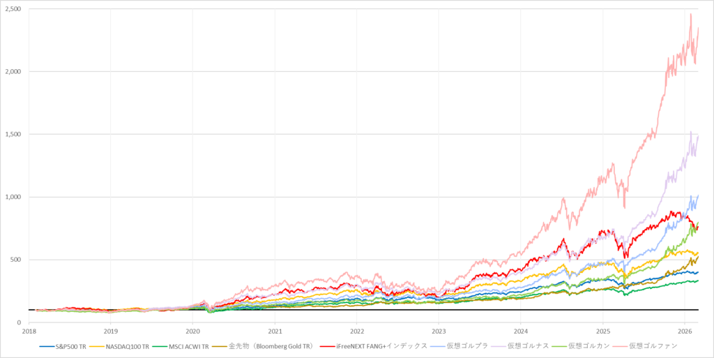 | S&P500 TR | NASDAQ100 TR | MSCI ACWI TR | 金先物(Bloomberg Gold TR) | iFreeNEXT FANG+インデックス | 仮想ゴルプラ | 仮想ゴルナス | 仮想ゴルカン | 仮想ゴルファン |