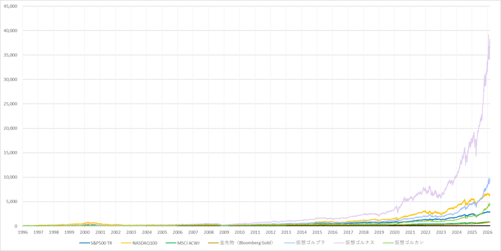 | S&P500 TR | NASDAQ100 | MSCI ACWI | 金先物(Bloomberg Gold) | 仮想ゴルプラ | 仮想ゴルナス | 仮想ゴルカン |