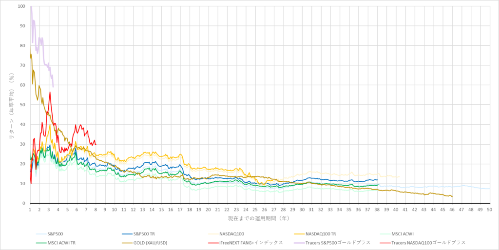 | 年数 | S&P500 | S&P500 TR | NASDAQ100 | NASDAQ100 TR | MSCI ACWI | MSCI ACWI TR | GOLD (XAU/USD) | SPDR Gold Shares (GLD) | iFreeNEXT FANG+インデックス | Tracers S&P500ゴールドプラス | Tracers NASDAQ100ゴールドプラス |
