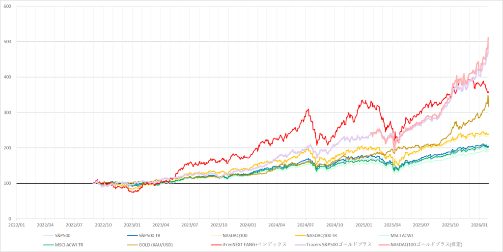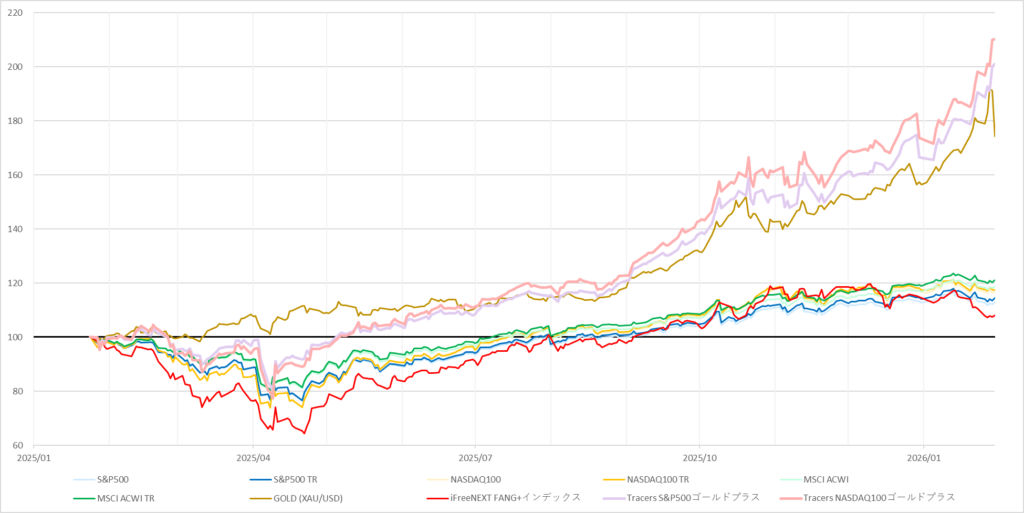 | S&P500 | S&P500 TR | NASDAQ100 | NASDAQ100 TR | MSCI ACWI | MSCI ACWI TR | GOLD (XAU/USD) | iFreeNEXT FANG+インデックス | Tracers S&P500ゴールドプラス | NASDAQ100ゴールドプラス(推定) |