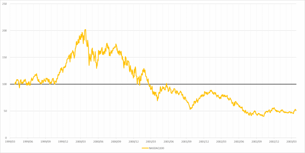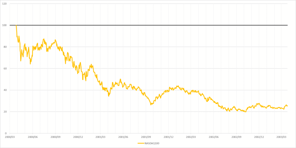 こちらはNASDAQ100のチャートですが、2000年のITバブル崩壊時に実際、最大で約-80%もの暴落を経験しています。