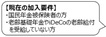 ただし、もうひとつの条件である「老齢基礎年金やiDeCoの老齢給付を受給していない方」は据え置きになっており、iDeCoの老齢給付は当然ですが、老齢基礎年金(=国民年金)を受給していない、ということは、