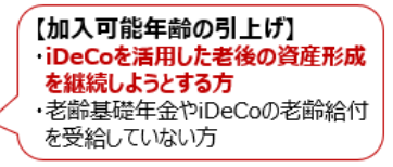 現在の加入条件である「国民年金被保険者の方」が、「iDeCoを活用した老後の資産形成を継続しようとする方」に変更になりますが、後者は自分次第ですので実質、この条件が無くなる(国民年金被保険者である必要が無くなる)のと同じです。