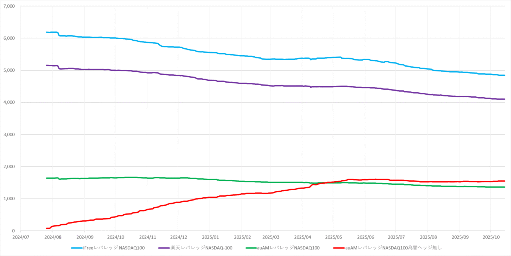 表の1行目はグラフの右端(現在)の数字、2行目はQLD(分配金込み・円換算ベース)との差なのですが、auレバナス為替ヘッジなし以外は為替ヘッジがあり、単純比較できないため、