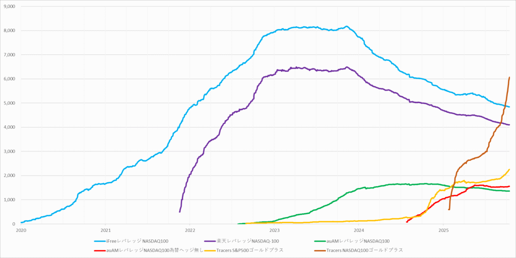 その大きな原因の一つは、おそらくゴルプラ(Tracers S&P500ゴールドプラス)とゴルナス(Tracers NASDAQ100ゴールドプラス)の登場でしょう。