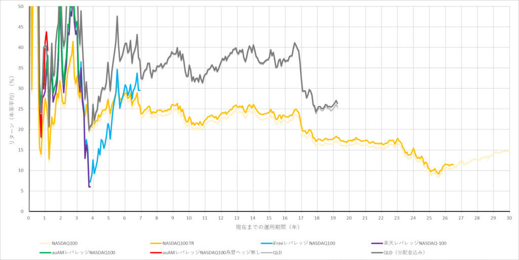 では、auレバナス為替ヘッジなしは今後も成長が見込めるのか、ですが、これは過去のQLD(分配金込み・円換算ベース)の長期リターンが参考になります。