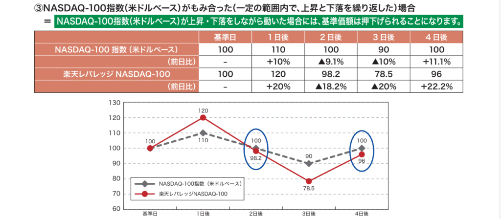 あくまで、レバレッジファンドは「日々の」基準価額の値動きが指数の〇倍程度を目指すものなので、2日以上の期間でのリターンが増えるとは限らないのですが、