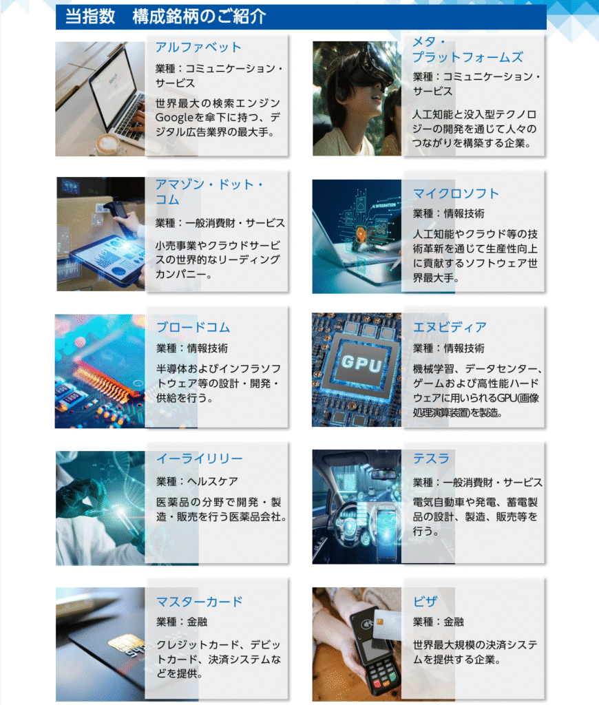 また、「米国市場に上場するグロース(成長)株のうち、時価総額上位10銘柄で構成」とあるのですが、単純にS&P500やNASDAQ100(からグロース株以外を除いた)上位10銘柄ではなく、独自の採用基準があり、その詳細については今のところ公開されていないようです。