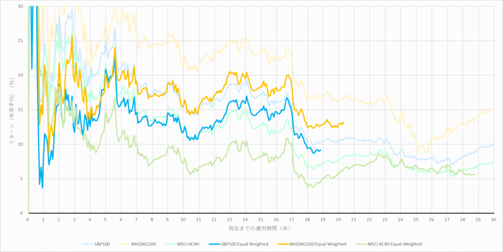 | 年数 | S&P500 | NASDAQ100 | MSCI ACWI | S&P500 Equal Weighted | NASDAQ100 Equal Weighted | MSCI ACWI Equal Weighted |