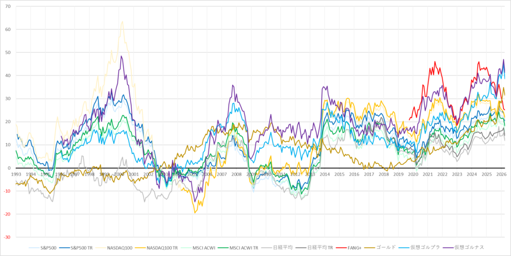 ただし、これは米国株を中心としたインデックス投資だけの話で、日本株やゴールドでは成立しません。