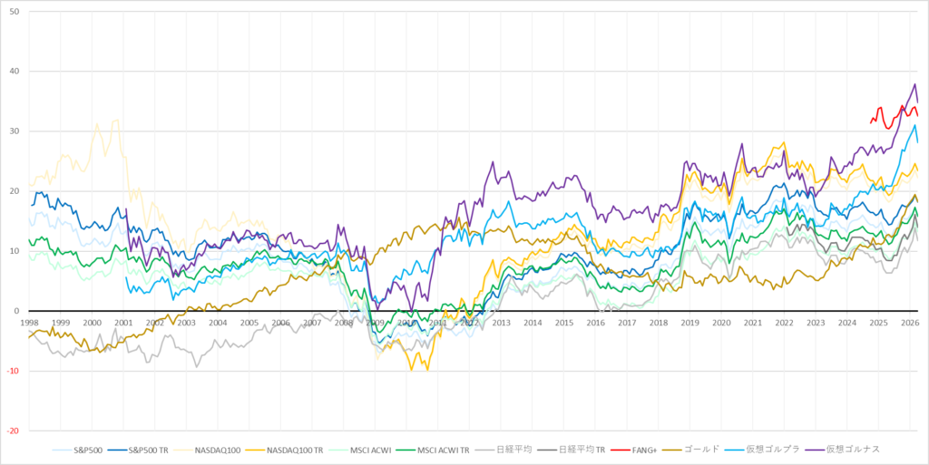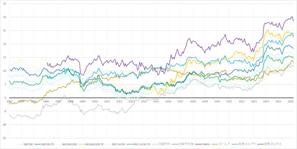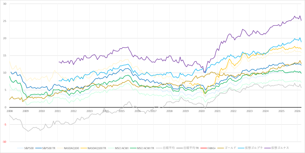 | S&P500 TR | NASDAQ100 | MSCI ACWI TR | 日経平均 | ゴールド | 仮想ゴルプラ | 仮想ゴルナス |