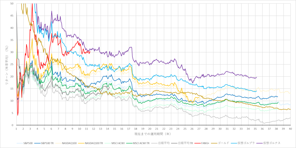| 年数 | S&P500 | S&P500 TR | NASDAQ100 | NASDAQ100 TR | MSCI ACWI | MSCI ACWI TR | 日経平均 | 日経平均 TR | TOPIX | FANG+ | ゴールド | 仮想ゴルプラ | 仮想ゴルナス |