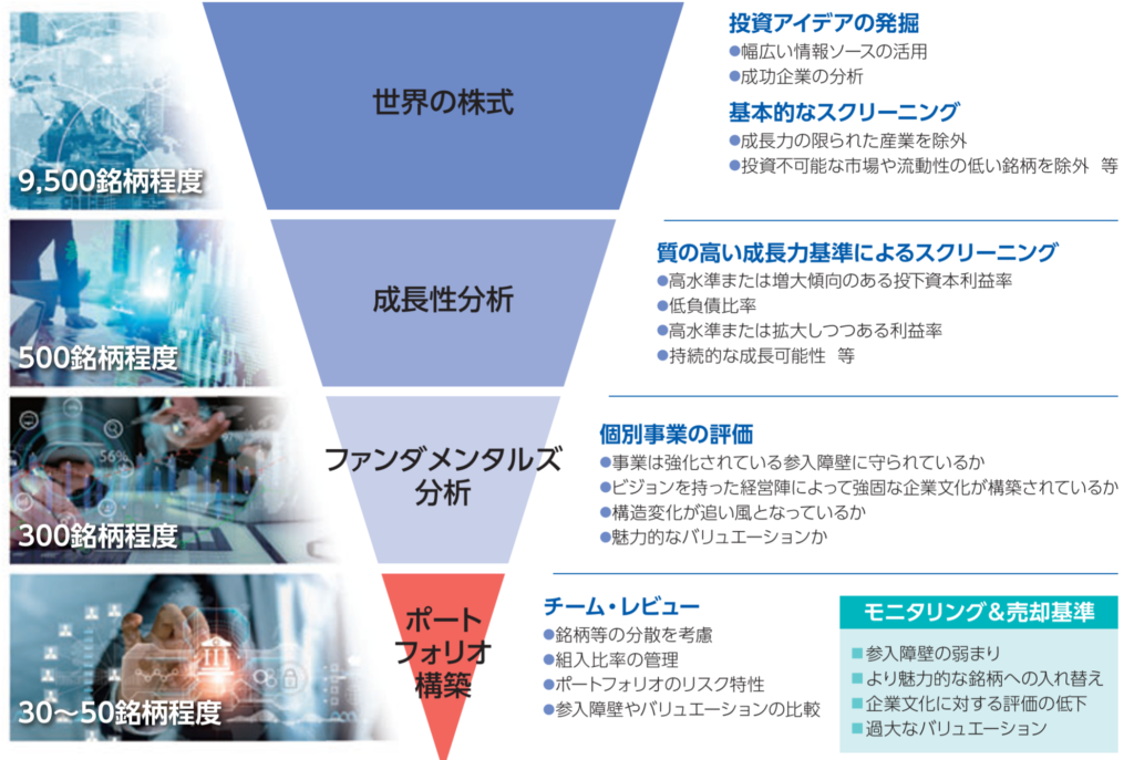 「WCM 世界成長株厳選ファンド(資産成長型)」(愛称:ネクスト・ジェネレーション)は、このように日本を含む世界各国の成長株から30~50銘柄を厳選し、集中投資を行うアクティブファンドです。