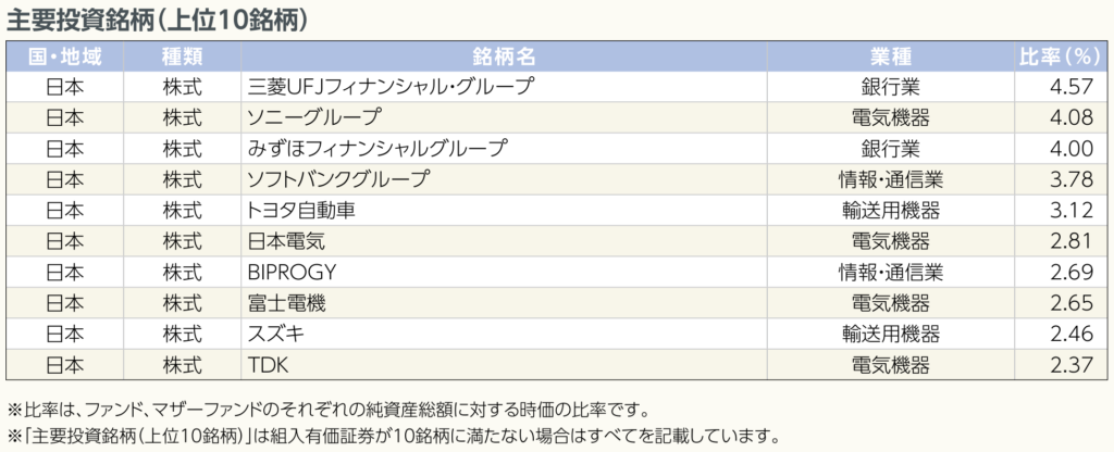 ですが、iFreeNEXTがNifty50指数に連動するのに対して、イーストスプリングにベンチマークは無く、組入上位銘柄は下記のようになっているため、こちらにお目当ての銘柄がある(比率が高い)のであればアリかと思います。
