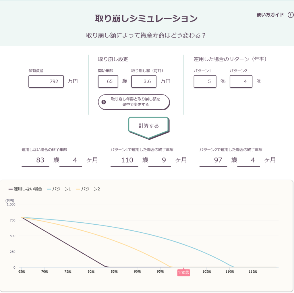 (年金が公的年金等控除+住民税の基礎控除(65歳以上の場合、年間153万円以下)に収まるなら、利益率が50%でも(132 - 43)/ 0.5 = 178万円(月14.8万円)まで取り崩せます)